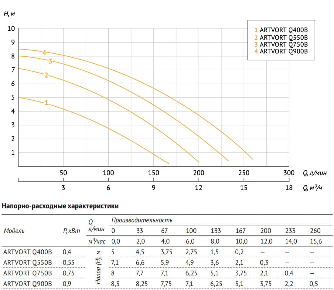 ARTVORT Q900B – одноступенчатый дренажный насос со встроенным поплавковым выключателем для перекачивания чистой, хлорированной, слегка загрязненной воды с максимальным размером примесей и включений не более 35 мм*.