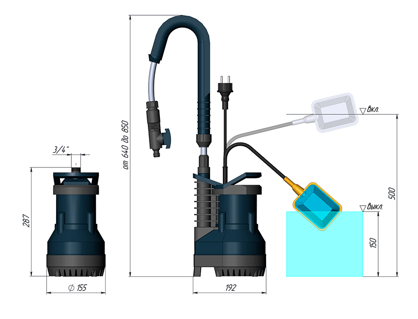с внешним поплавковым выключателем для перекачивания чистой, хлорированной, слегка загрязненной воды с максимальным размером примесей и включений не более 0,5 мм.