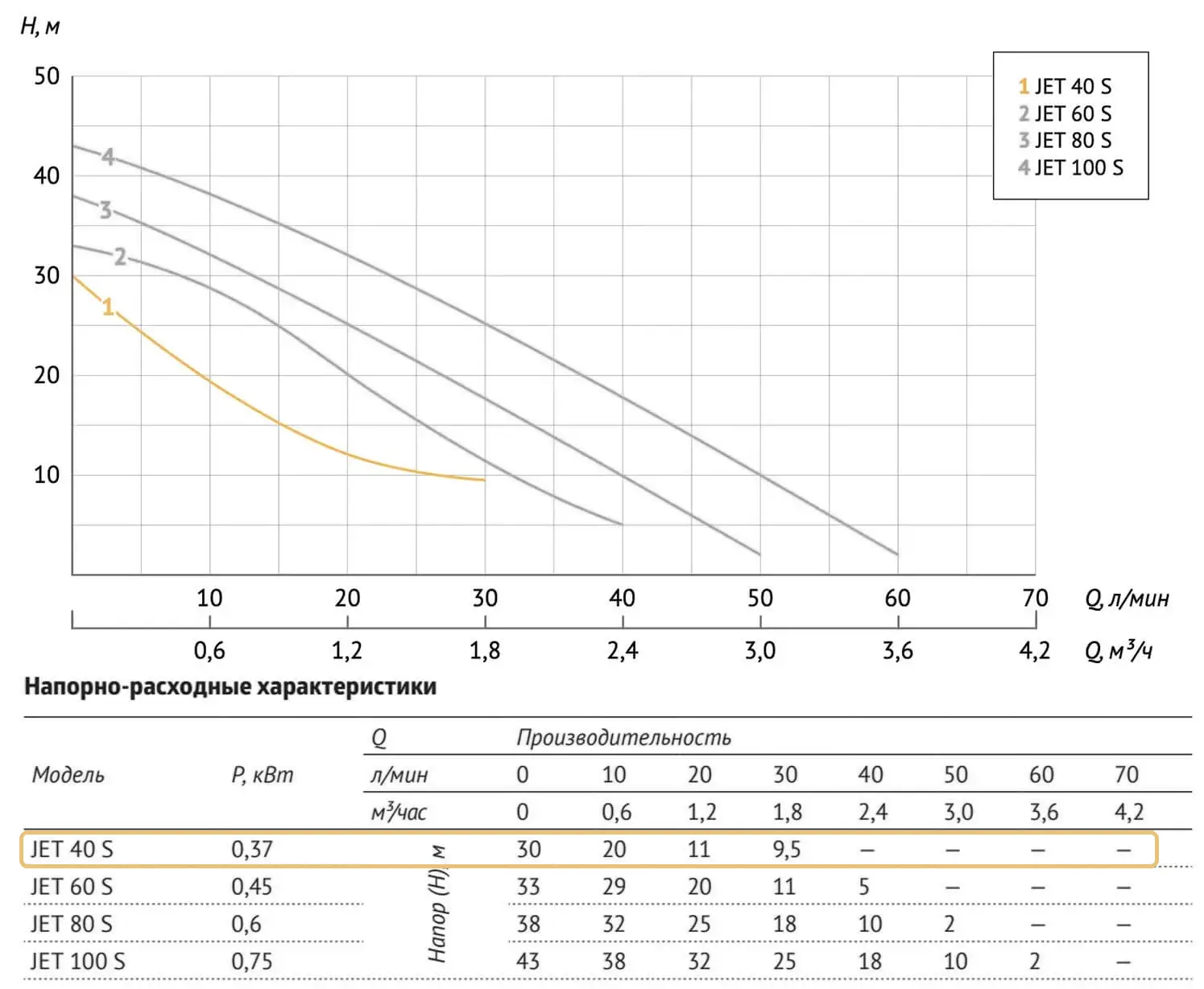 UNIPUMP JET 40S - однофазный одноступенчатый центробежный поверхностный насос с укороченным эжектором, чугунным корпусом,рабочим колесом из поликарбоната, медной обмоткой статора для подачи чистой холодной воды из скважин и колодцев (глубиной не более 8 метров), открытых водоемов, резервуаров и других источников водоснабжения.