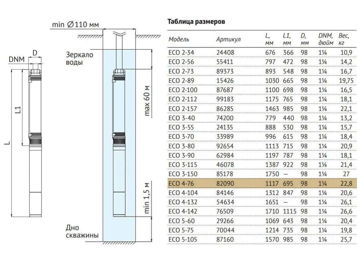 Погружной насос 4" ECO 4-76 (1.5 кВт,50 м)