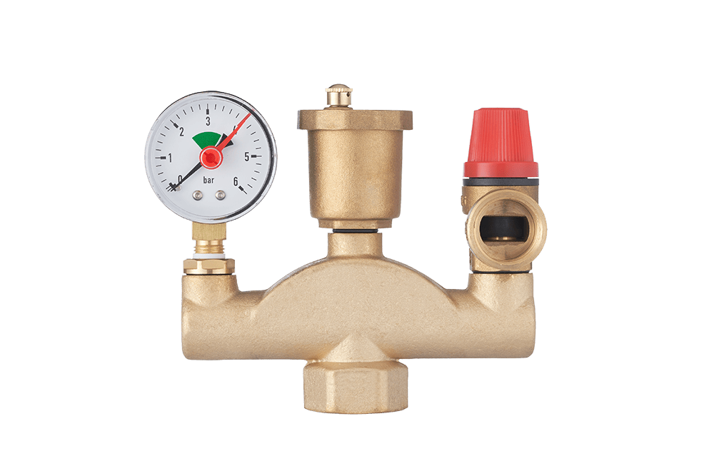 Группа безопасности котла состоит из предохранительного клапана с настраиваемым диапазоном максимального давления, автоматического поплавкового воздухоотводчика, обратного клапана и манометра.