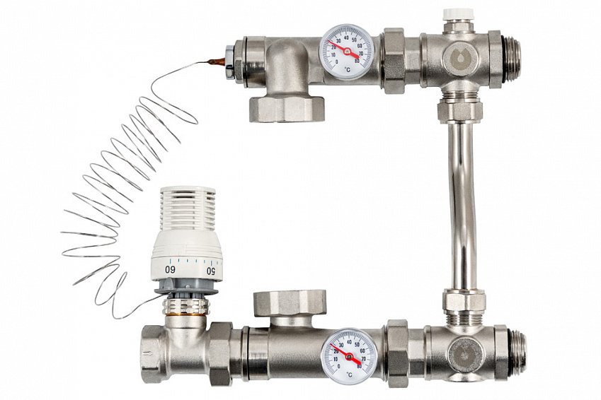 Регулирование температуры теплоносителя поступающего в контуры происходит автоматически, с помощью термостатического клапана с термоголовкой, путём частичного отбора теплоносителя от высокотемпературного источника тепла первичного контура и смешения с теплоносителем, поступающим из обратного коллектора.